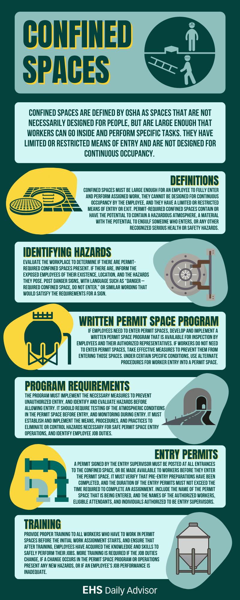 Because your workers are, in essence, putting their lives on the line to perform these duties, it’s crucial that you follow these confined space safety guidelines to protect your employees. View the infographic below, courtesy of EHS Daily Advisor: